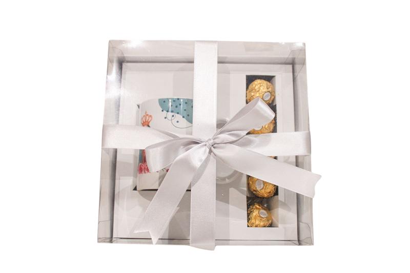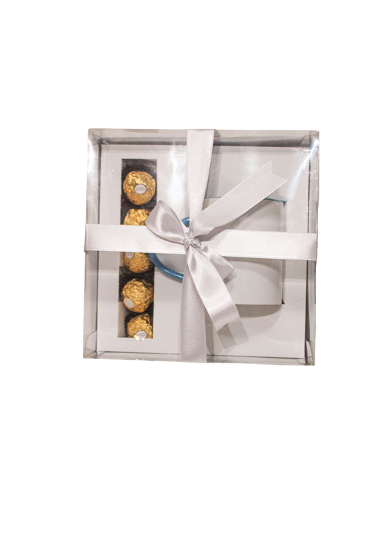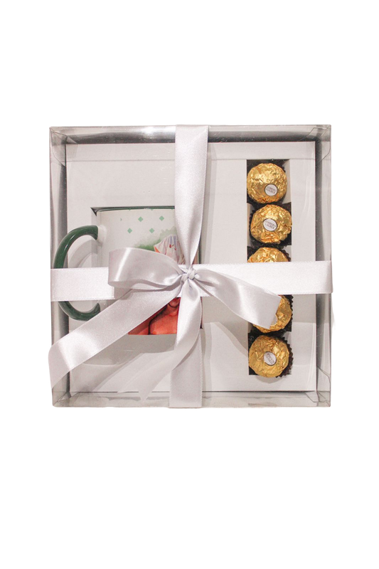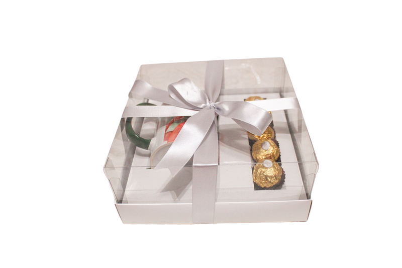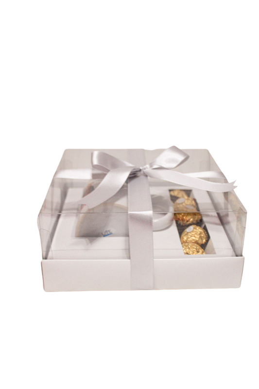 Caneca Branca sendo com foto ou caricatura na caixa com 5 Ferrero Rocher e laço